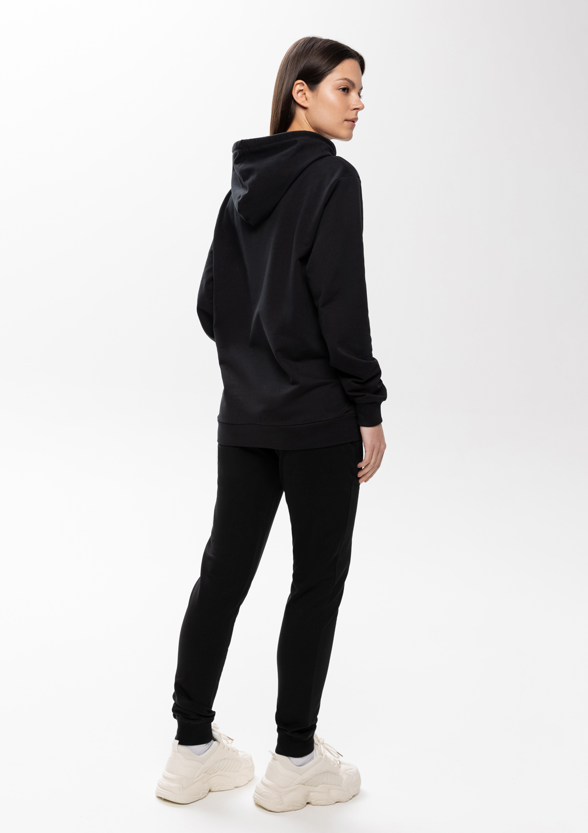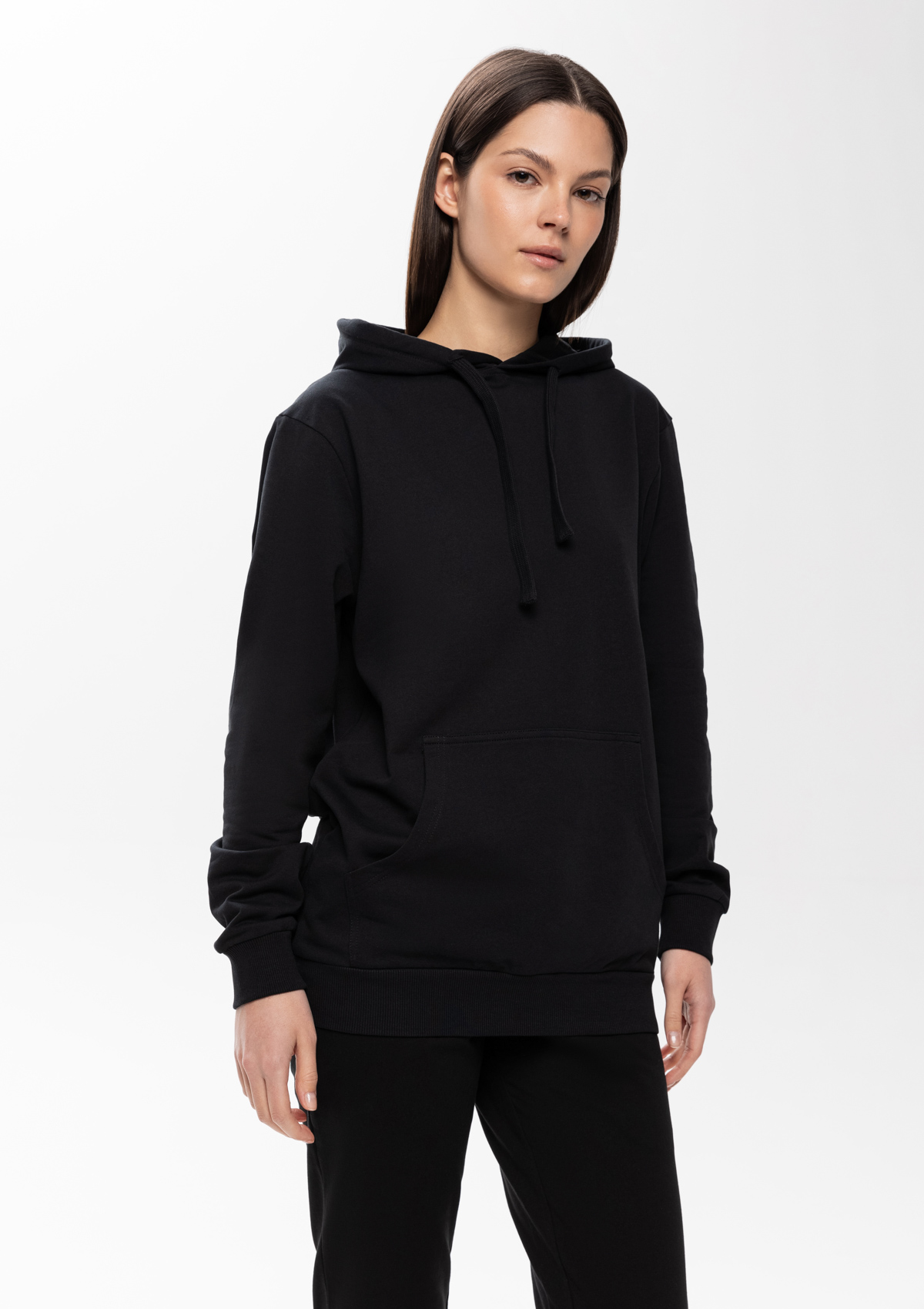 Толстовка прямого силуэта с капюшоном, втачным рукавом и карманом-кенгуру. Капюшон дополнен шнурком для регулирования прилегания, манжет и низ изделия оформлены широкой эластичной резинкой. Возможно два варианта исполнения: контрастные шнурок и бейка/шнурок и бейка в цвет толстовки.<br />