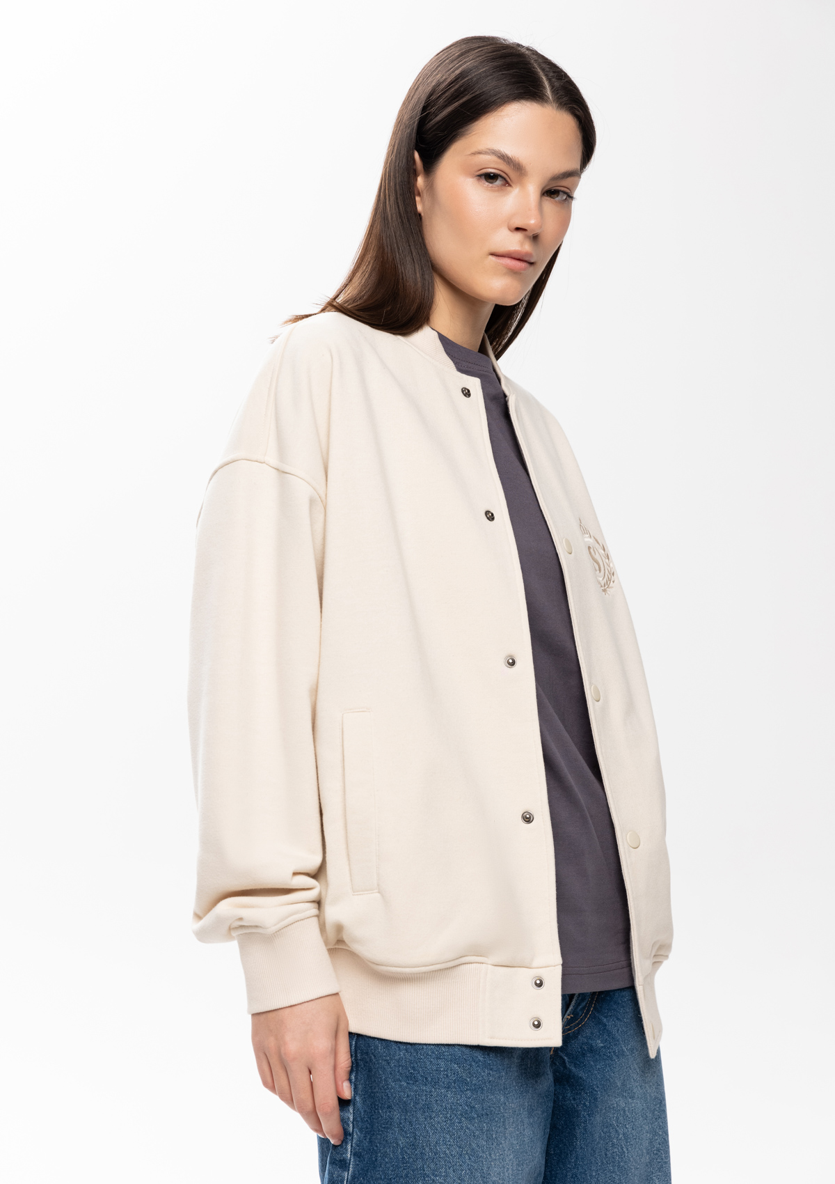 Размер женского бомбера: S/46. Параметры модели: рост 173 см.; обхват груди 80 см.; обхват талии 58 см.; обхват бедер 89 см.<br />