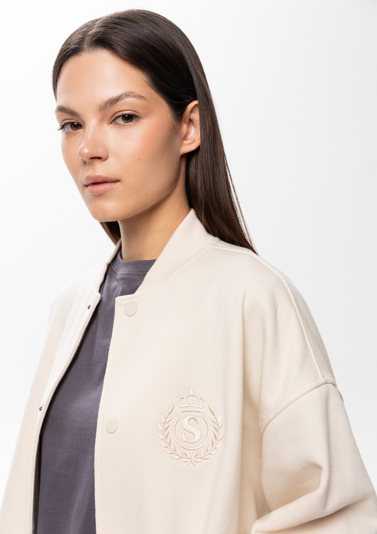 Классика, проверенная временем. Культовый силуэт в сочетании с универсальными оттенками станет ярким акцентом на спортивных и студенческих мероприятиях, сделает образ расслабленным и динамичным одновременно.<br /> <br /> Модель прямого силуэта с воротником-стойкой, спущенной линией плеча, прорезным карманом и застежкой на кнопки. Для наиболее плотного прилегания манжет и низ изделия выполнены из рибаны &#40;95&#37; хлопок, 5&#37; эластан&#41; в тон основному цвету.<br /> <br /> Бомбер выполнен из плотного и приятного к телу материала футер 3-х нитка &#40;70&#37; хлопок, 30&#37; эластан&#41;. Дышащий материал хорошо отводит влагу, сохраняя комфортный микроклимат внутри изделия. Благодаря тройной нити полотно отличается высокой прочностью, что делает его и устойчивым к механическим повреждениям.<br /> <br /> Размер женского бомбера: S/46. Параметры модели: рост 173 см.; обхват груди 80 см.; обхват талии 58 см.; обхват бедер 89 см.<br /> <br /> Размер на модели: XL/52. Параметры модели: рост 190 см.; обхват груди 108 см.; обхват талии 87 см.; обхват бедер 104 см.