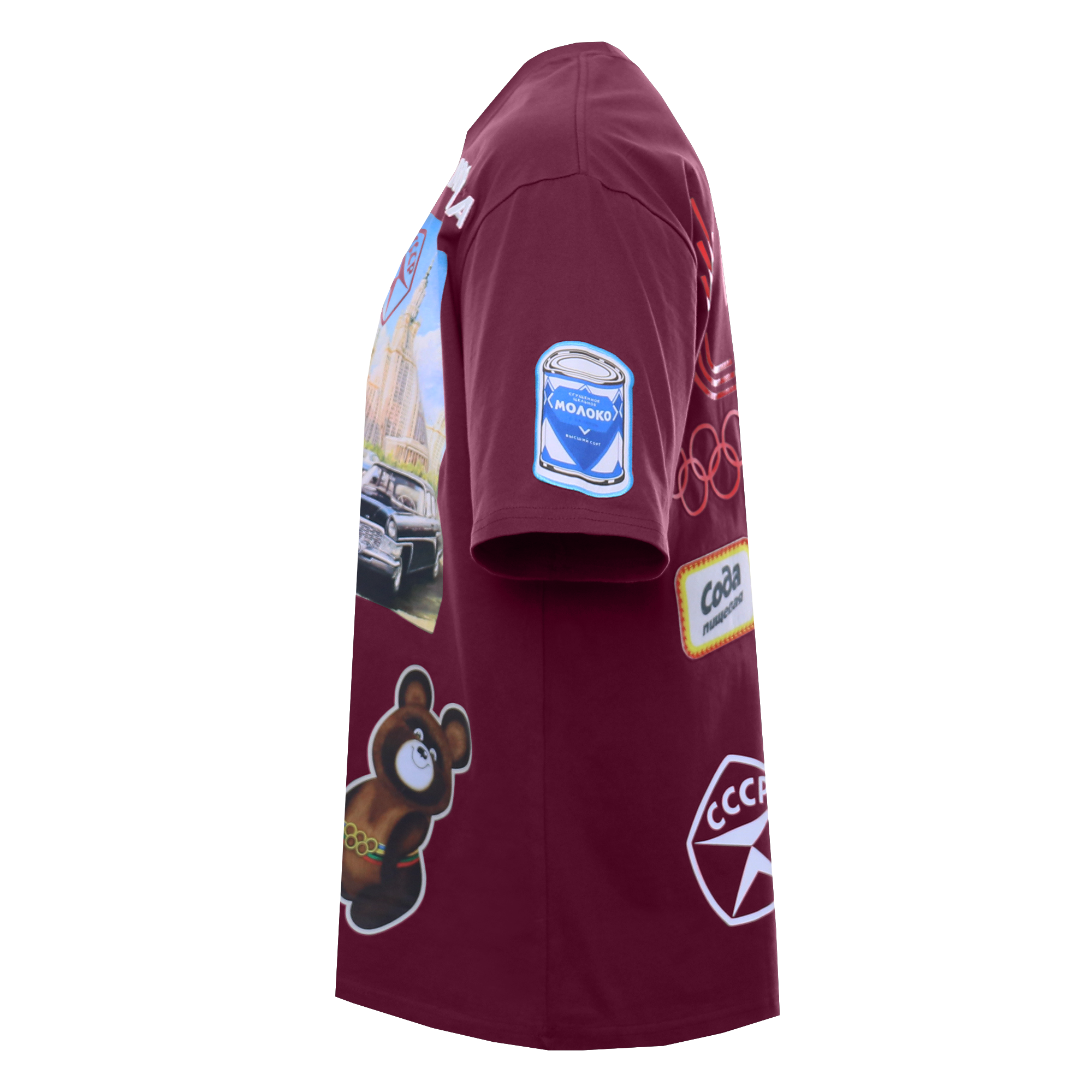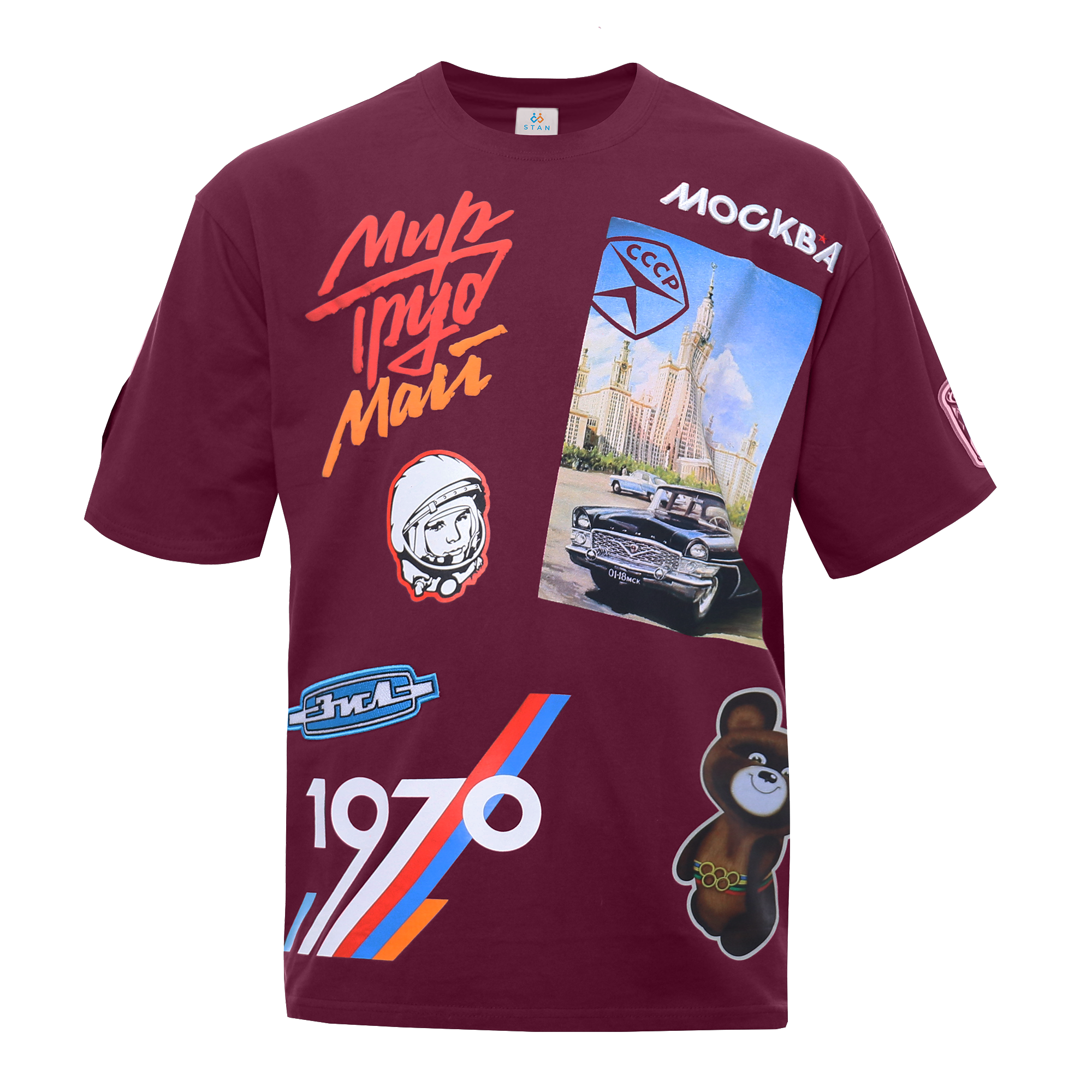 Уникальная модель*, персонализированная с помощью практически всех технологий нанесения, которые возможно реализовать на производственной площадке STAN в данный момент.<br /> <br /> Вдохновением для создания футболки послужили образы, знакомые одним по трендам в поп-культуре, и близкие другим благодаря своей ностальгической ценности. Олимпийский мишка, та самая упаковка соды и другие символы советской культуры по-прежнему вызывают интерес, создавая связь между поколениями. Разрабатывая данную модель, мы ориентировались на ключевые ценности компании STAN: качество, креативность и стиль.<br /> <br /> В качестве основы мы использовали футболку арт. 56, ставшую бестселлером в 2024 году внутри текстильного каталога STAN: oversize-силуэт, насыщенный природный оттенок зеленого и хлопковая кулирная гладь плотностью 240 грамм. <br /> <br /> Грудь:<br /> - слоган [Мир, труд, майk выполнен шелкографией вспенкой;<br /> - портрет Юрия Гагарина напечатан светонакапливающими красками;<br /> - логотип первого автомобилестроительного предприятия в СССР [ЗИЛk вышивной шеврон;<br /> - яркий принт [1970k отражает возможности классической шелкографии в плане четкости линий и яркости цвета;<br /> - [Москваk, напечатанная одним из культовых шрифтов советской эпохи, выполнена вышивкой с пуфом, красная звезда классическая вышивка;<br /> - атмосферу и полноцветность советской открытки удалось передать благодаря растровой шелкографии с эффектом травления;<br /> - олимпийский мишка, символ дружбы и советского единства, напечатан с помощью DTF.<br /> <br /> Правый рукав: <br /> - вышивной шеврон- патч с изображением первого в мире искусственного спутника Земли [Спутник-1k.<br /> <br /> Левый рукав: <br /> - банка сгущенки, в легендарном дизайне, который по-прежнему с нами сублимационный шеврон.<br /> <br /> Спина: <br /> - [Куражk и еще один узнаваемый шрифт выполнены классической вышивкой, плотным застилом;<br /> - эмблема программы [Интеркосмосk перенесена на футболку с помощью шелкотрансфера;<br /> - динамику, напечатанного ретро-шрифтом слова [спортk, усиливает шелкография лаком;<br /> - символика XXII летних Олимпийский игр объединила в себе сразу три технологии нанесения: глиттер, лак и шелкография высоким слоем;<br /> - пищевая сода, один из самых [трогательныхk элементов персонализации нашей футболки, который выполнен пришивным фетровым шевроном;<br /> - запечатленный на плакате момент запуска первого искусственного спутника земли [оживилиk с помощью шелкографии вспенкой;<br /> - государственный знак качества СССР выделили особенным спецэффектом шелкографии светоотражающим флексом;<br /> - красный москвич, символ детства и юности многих из нас, перенесен на текстиль с помощью DTF.<br />
