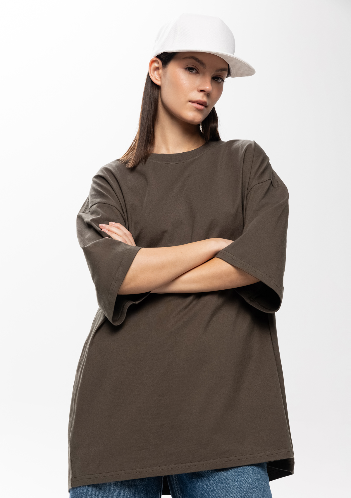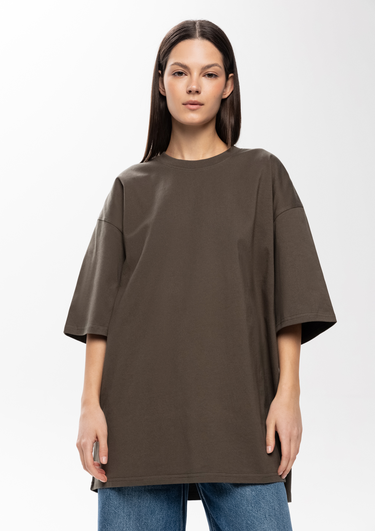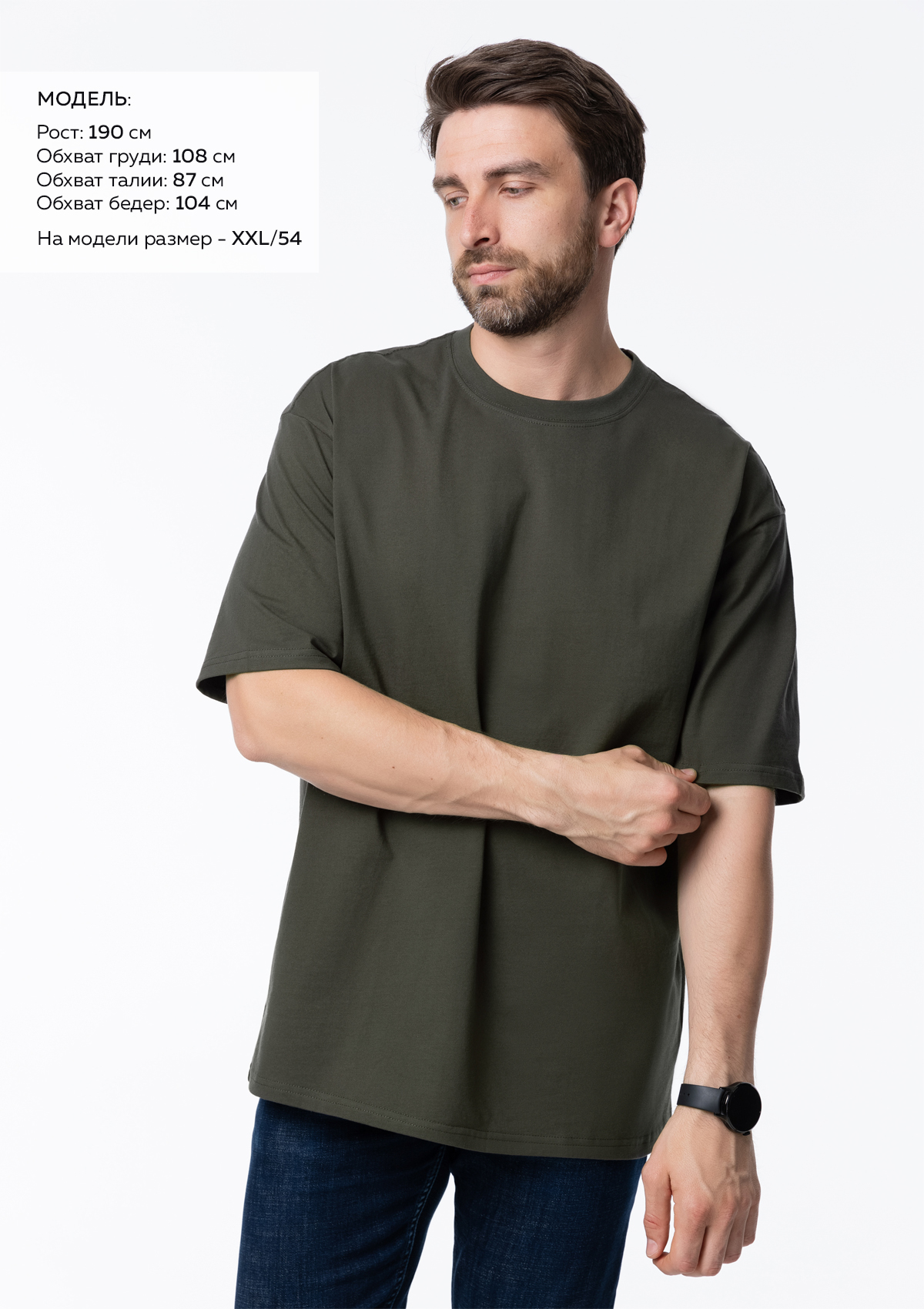 Универсальная футболка силуэта-oversize с округлым воротом и спущенной линией плеча.<br />