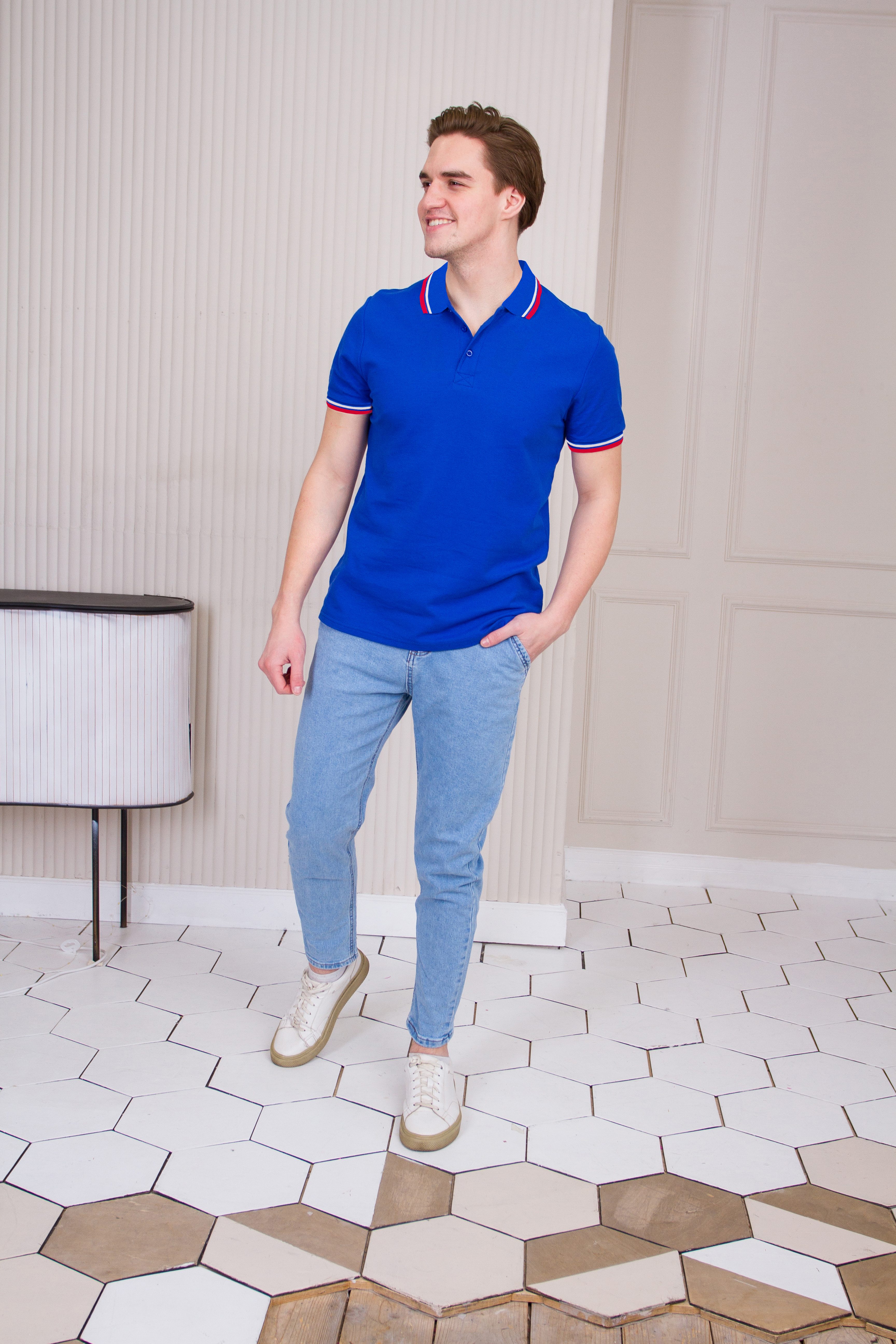 Мужская рубашка поло прямого силуэта с отложным воротником, втачным коротким рукавом и застежкой на пуговицы. Воротник и манжет оформлены тесьмой в цвете [триколорk.<br />