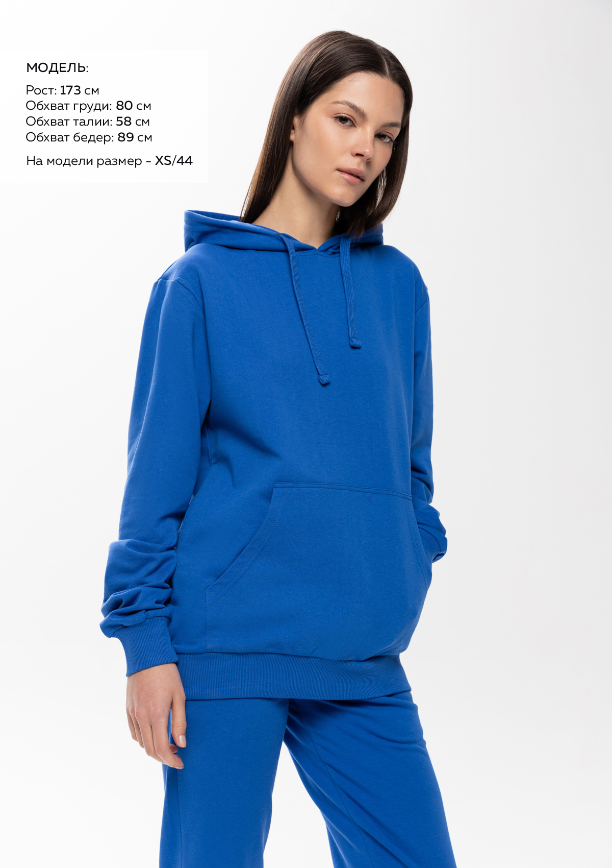 Размер женского худи: XXS/42. Параметры модели: рост 173 см.; обхват груди 80 см.; обхват талии 58 см.; обхват бедер 89 см.<br />