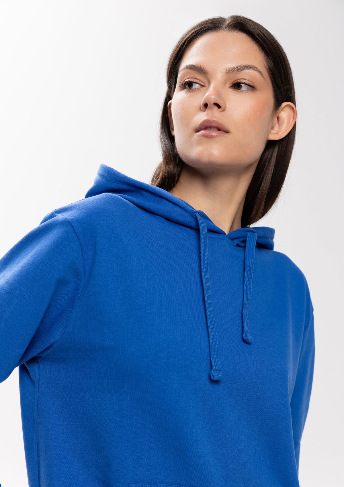 Толстовка прямого силуэта с капюшоном, втачным рукавом и карманом-кенгуру. Капюшон дополнен шнурком для регулирования прилегания, манжет и низ изделия оформлены широкой эластичной резинкой. Возможно два варианта исполнения: контрастные шнурок и бейка/шнурок и бейка в цвет толстовки.<br />