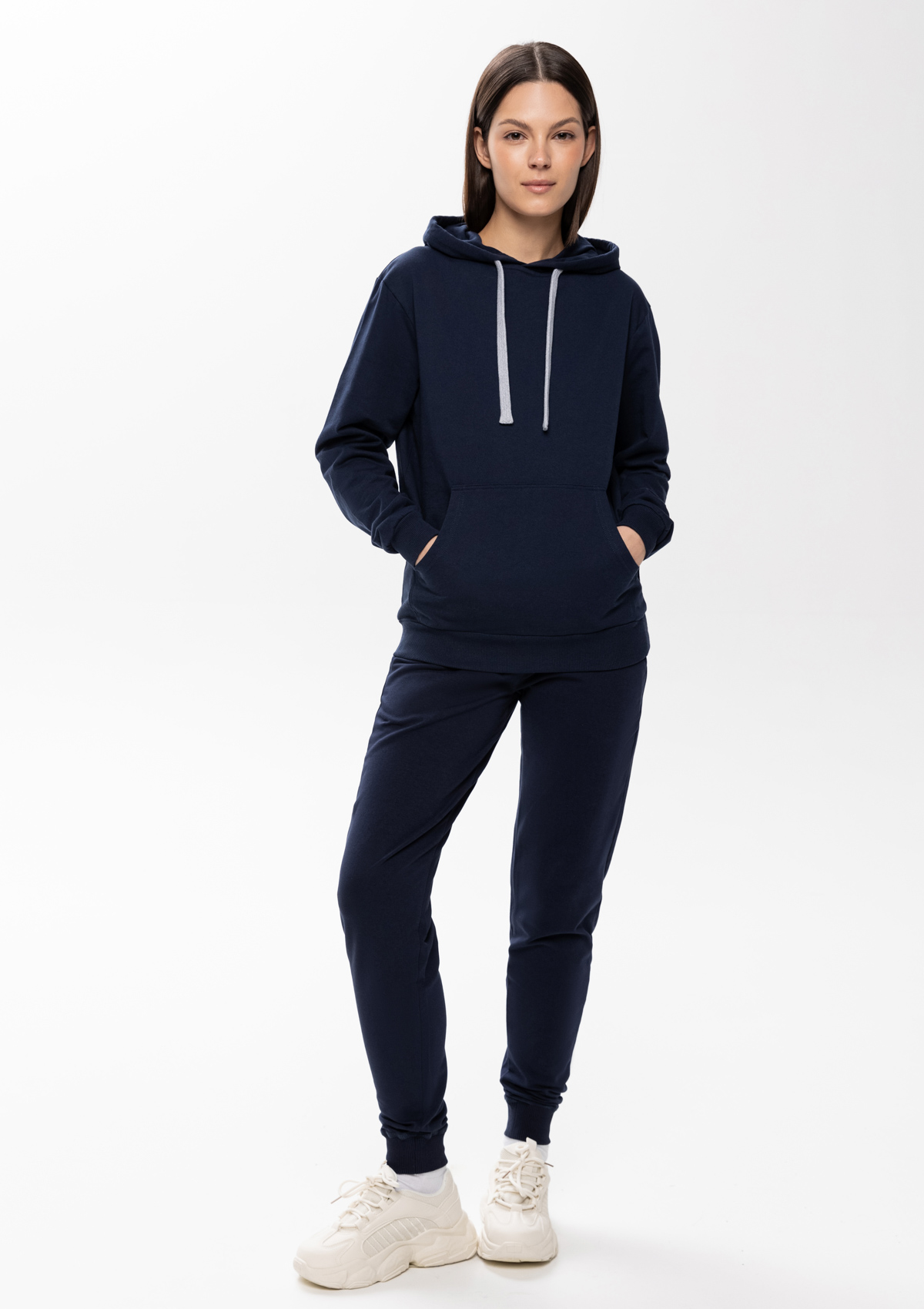 Толстовка прямого силуэта с капюшоном, втачным рукавом и карманом-кенгуру. Капюшон дополнен шнурком для регулирования прилегания, манжет и низ изделия оформлены широкой эластичной резинкой. Возможно два варианта исполнения: контрастные шнурок и бейка/шнурок и бейка в цвет толстовки.<br />