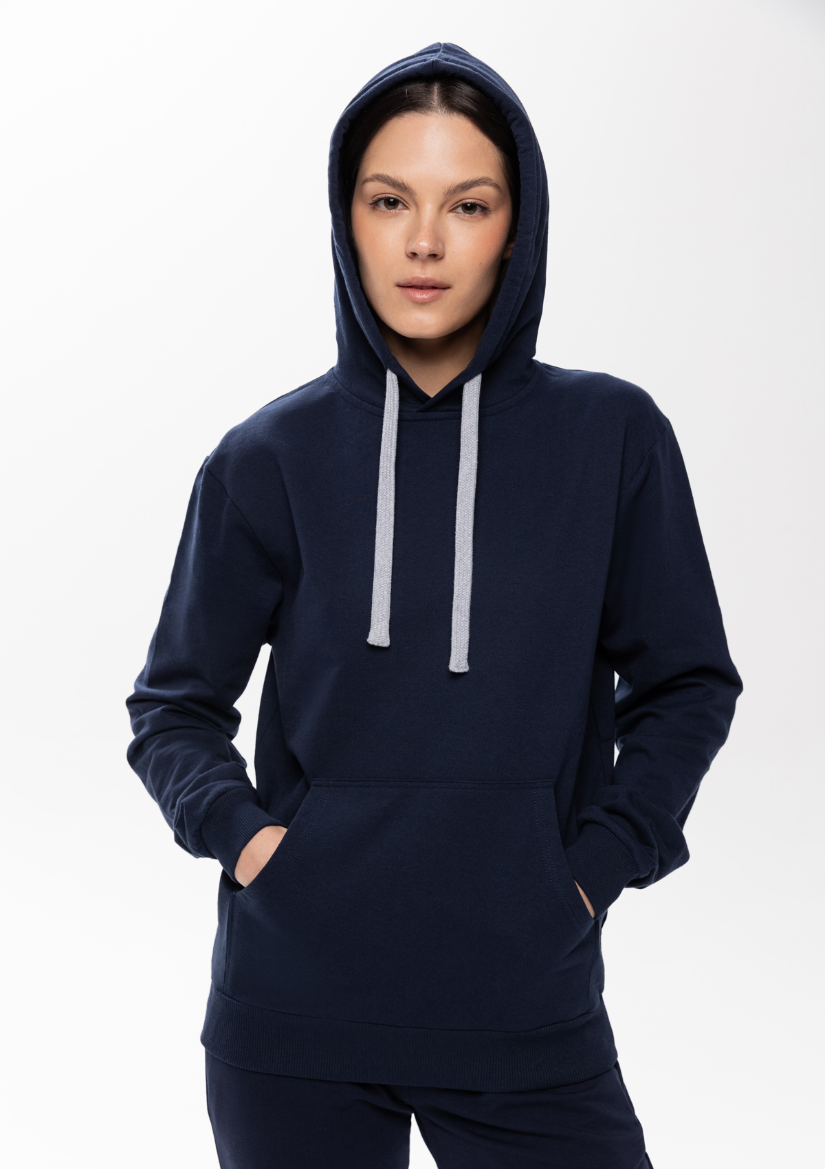 Толстовка прямого силуэта с капюшоном, втачным рукавом и карманом-кенгуру. Капюшон дополнен шнурком для регулирования прилегания, манжет и низ изделия оформлены широкой эластичной резинкой. Возможно два варианта исполнения: контрастные шнурок и бейка/шнурок и бейка в цвет толстовки.<br />