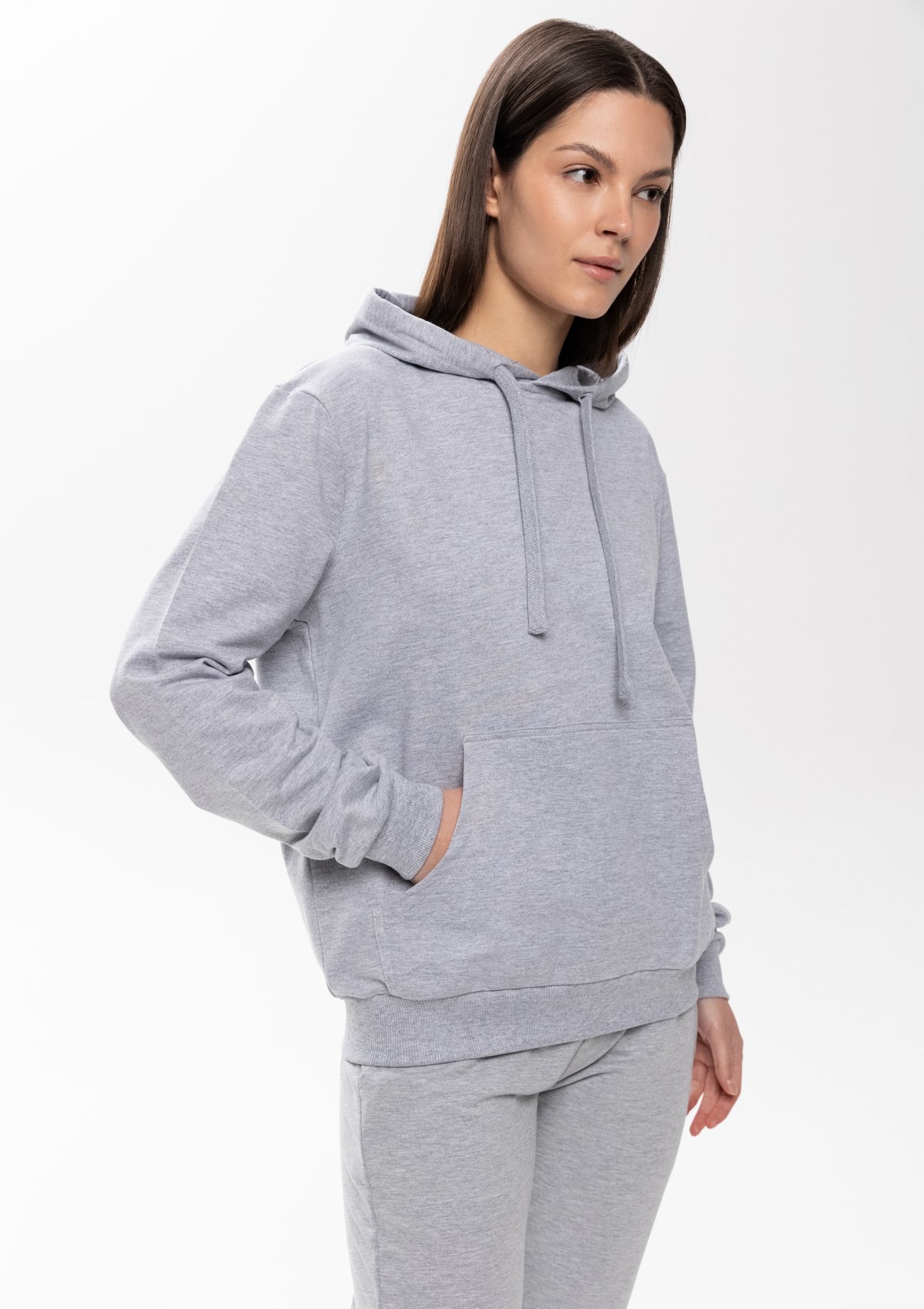 Толстовка прямого силуэта с капюшоном, втачным рукавом и карманом-кенгуру. Капюшон дополнен шнурком для регулирования прилегания, манжет и низ изделия оформлены широкой эластичной резинкой. Возможно два варианта исполнения: контрастные шнурок и бейка/шнурок и бейка в цвет толстовки.<br />