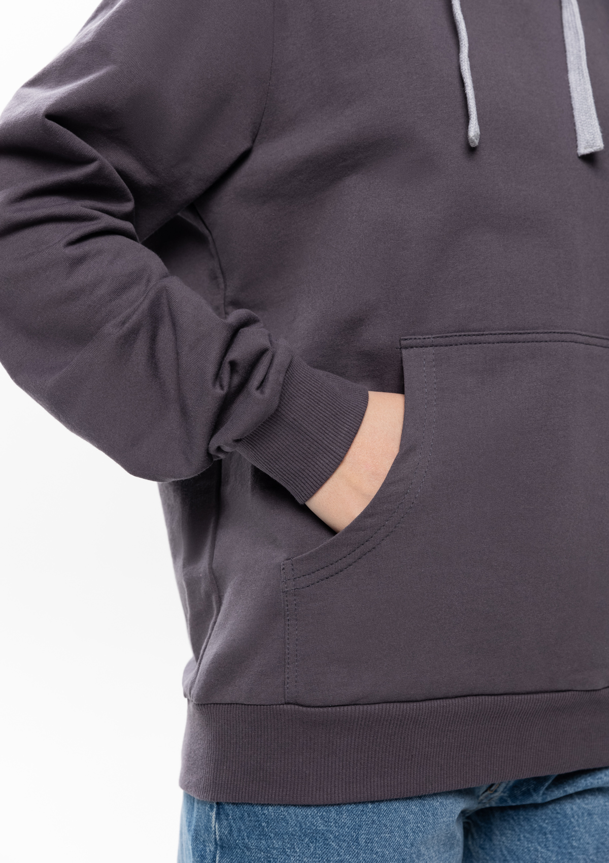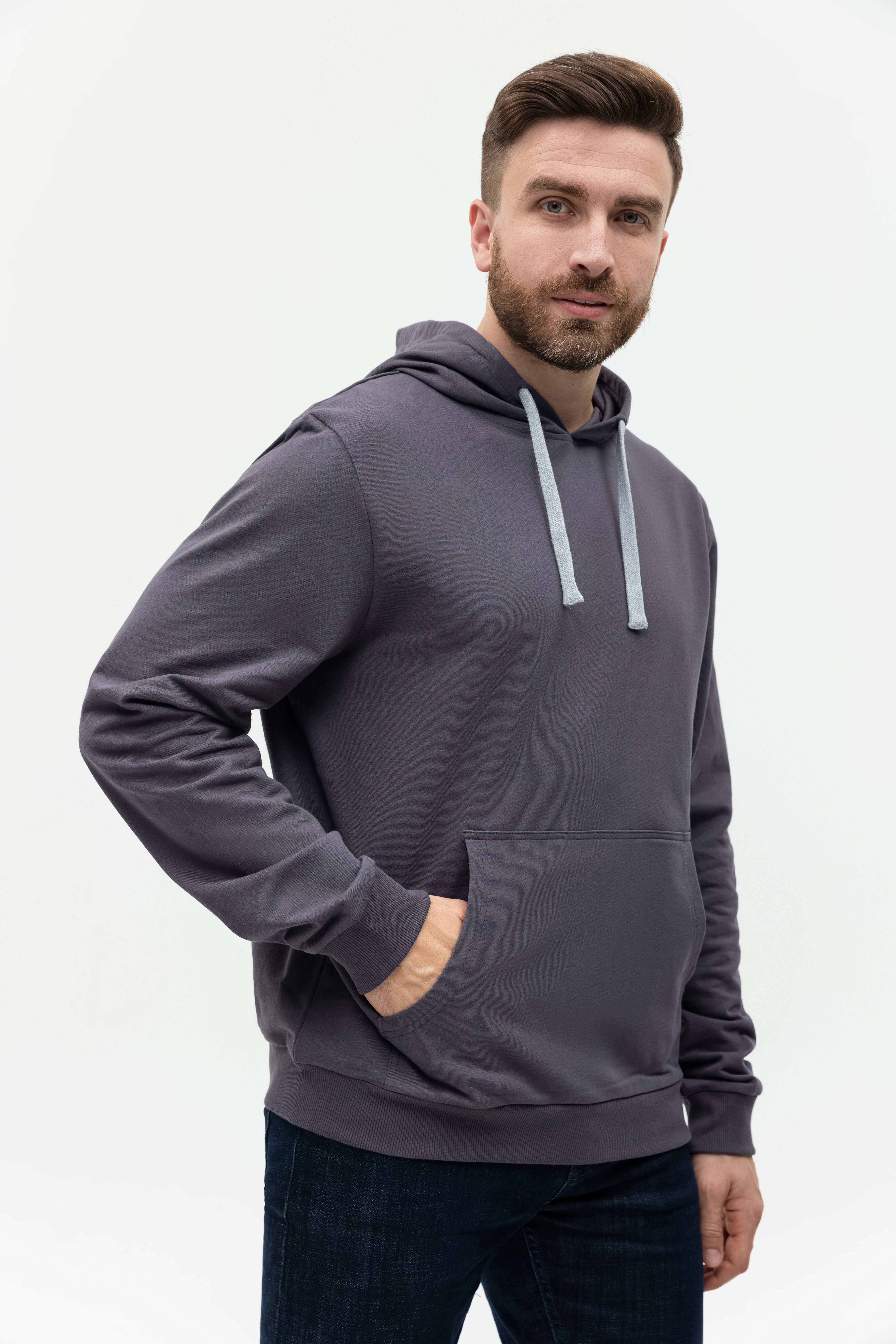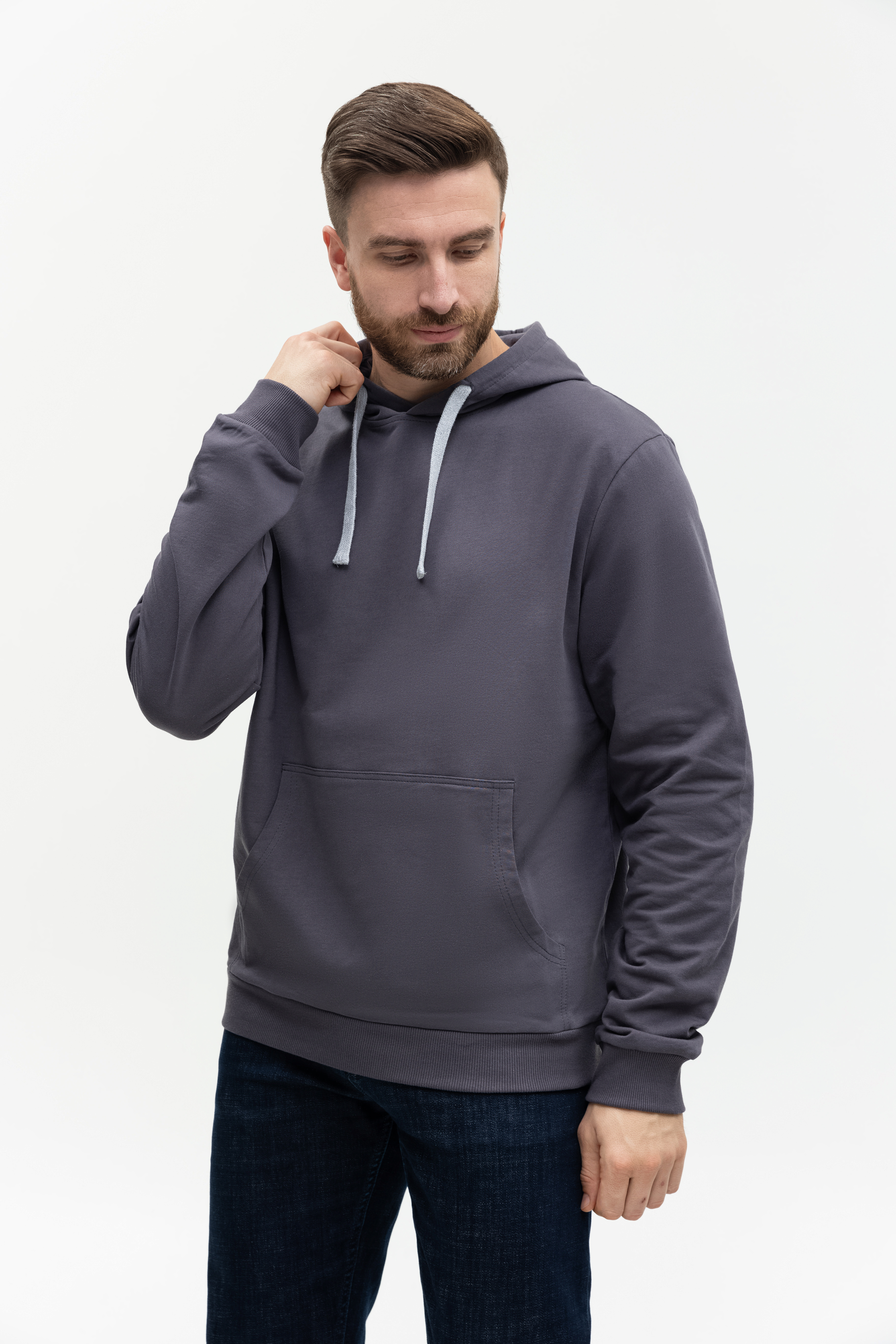 Толстовка прямого силуэта с капюшоном, втачным рукавом и карманом-кенгуру. Капюшон дополнен шнурком для регулирования прилегания, манжет и низ изделия оформлены широкой эластичной резинкой. Возможно два варианта исполнения: контрастные шнурок и бейка/шнурок и бейка в цвет толстовки.<br />