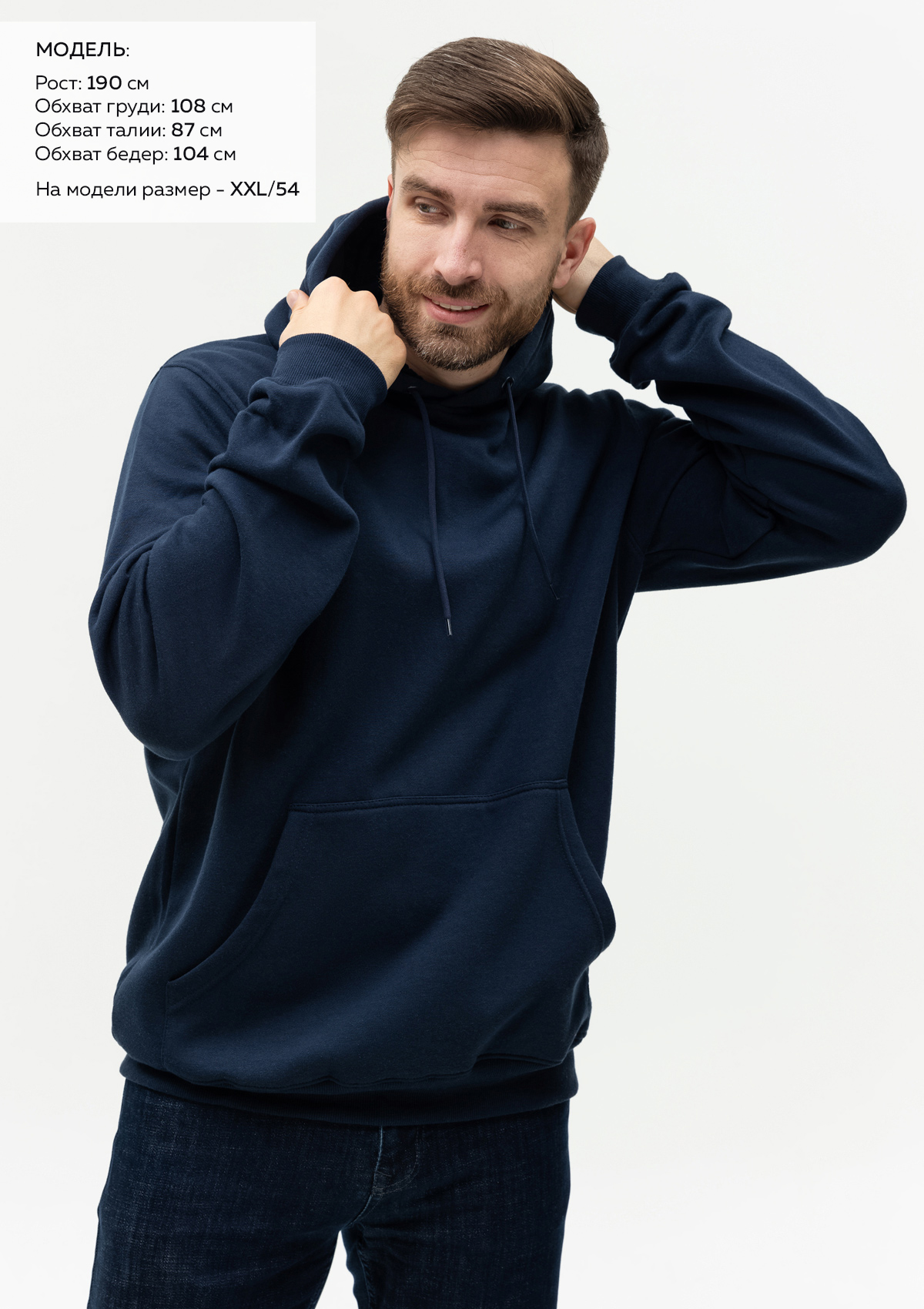 Размер мужского худи: XXL/54. Параметры модели: рост 190 см.; обхват груди 108 см.; обхват талии 87 см.; обхват бедер 104 см.Характеристики: