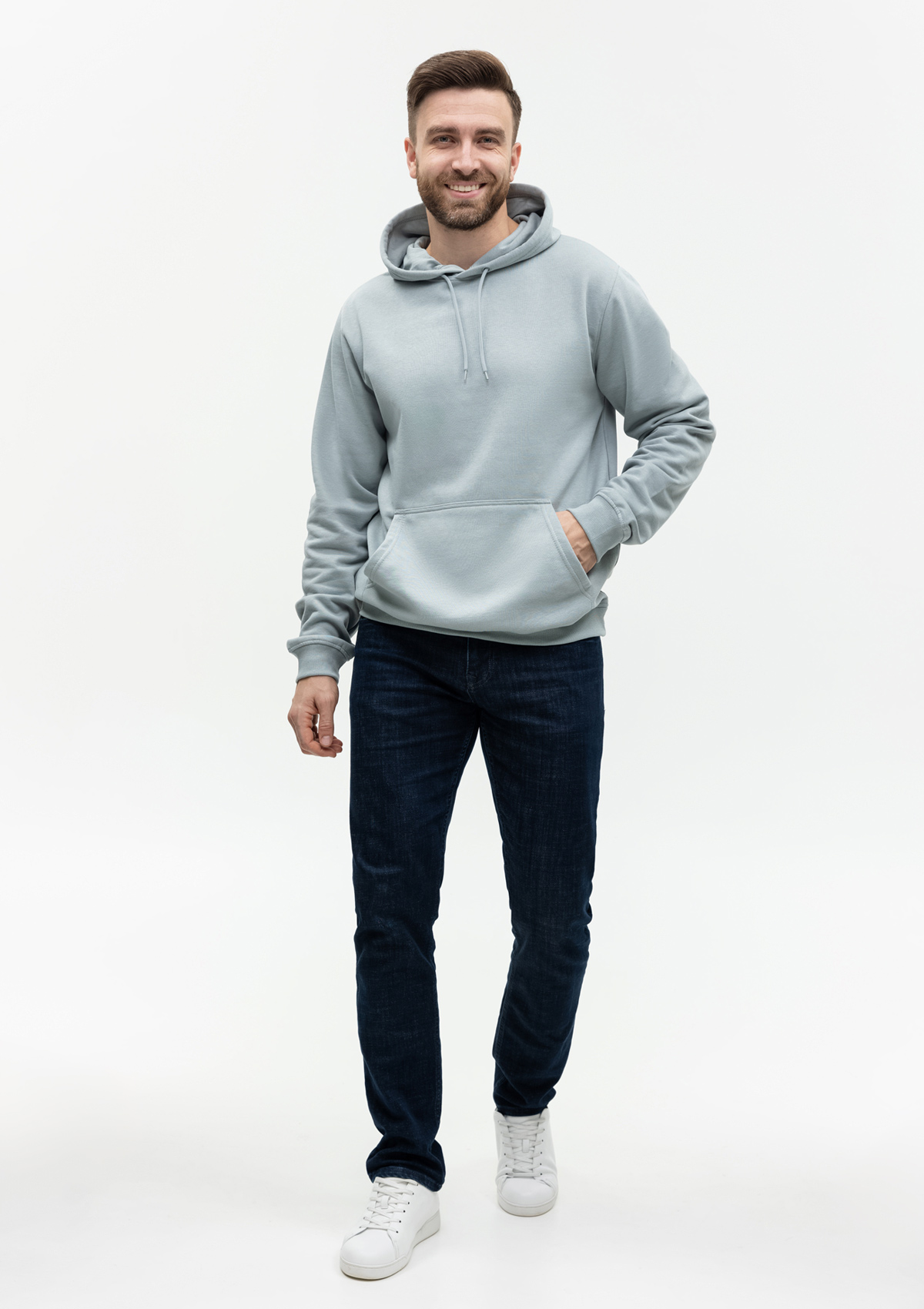 Толстовка унисекс прямого силуэта с капюшоном, втачным рукавом и карманом-кенгуру. Капюшон дополнен шнурком для регулирования прилегания, манжет и низ изделия оформлены широкой эластичной резинкой. Возможно несколько вариантов исполнения толстовки. <br />