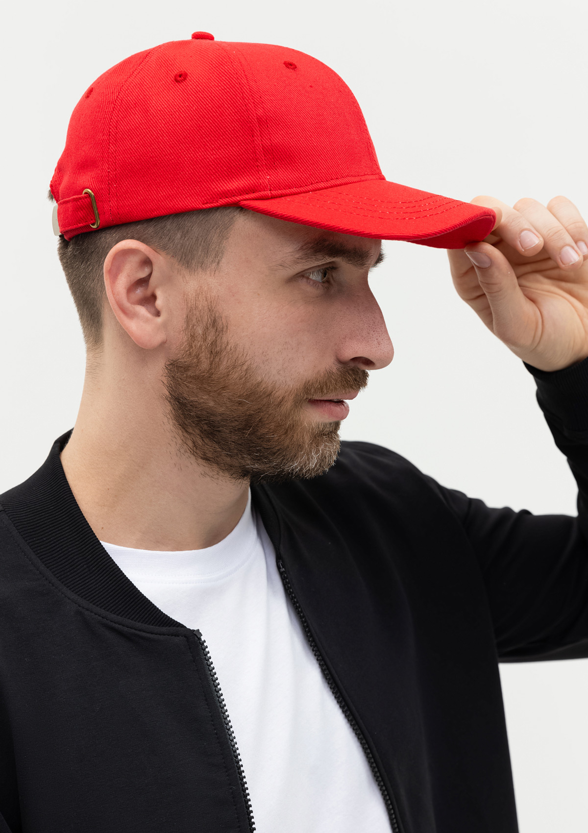 Бейсболка-шестиклинка с изогнутым жестким козырьком, прилегание регулируется ремешком с металлической застежкой. <br />