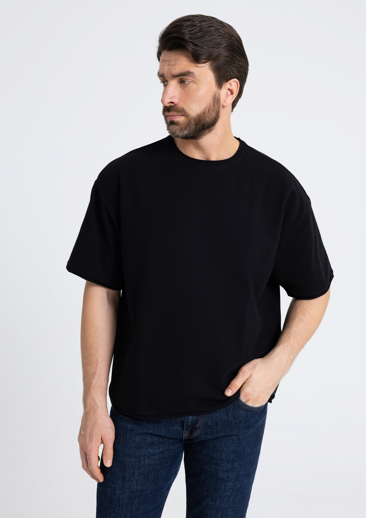 Футболка свободного силуэта с необработанными краями поможет создать стильный и неформальный образ. Данную футболку легко сочетать с джинсами, юбками и шортами, что делает модель универсальным выбором как для мероприятий, так и для униформы.<br /> <br /> Футболка оверсайз-силуэта со спущенной линией плеча и необработанным краем рукава, горловины и по низу изделия.<br /> <br /> Изделие выполнено из легкого, но плотного материала футера 2 нитки &#40;95&#37; хлопок, 5&#37; эластан&#41;.<br /> <br /> Размер мужской футболки: XL/52. Параметры модели: рост 190 см.; обхват груди 108 см.; обхват талии 87 см.; обхват бедер 104 см.